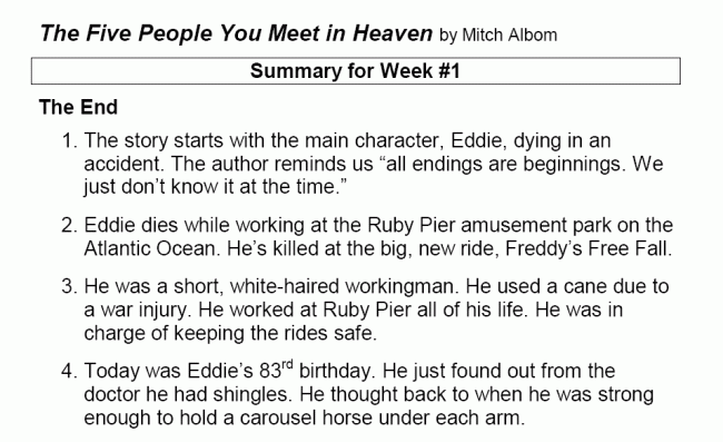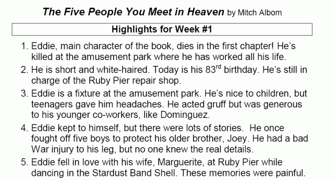 A fable about an ordinary man named Eddie. He meets five people from his life―each with a story to tell, a secret to reveal, and a lesson to share.