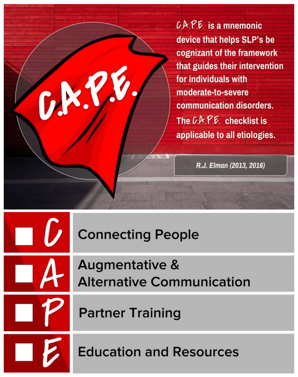 These downloadable cards serve as a checklist for speech-language pathologists of four essential intervention categories. See the ACC Publications page for additional information about CAPE.